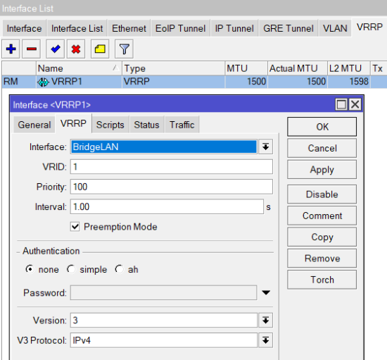 → Tiếp đến, bạn cần khởi tạo một Router ảo bằng chức năng VRRP tại Menu Interface –> Thẻ VRRP.
