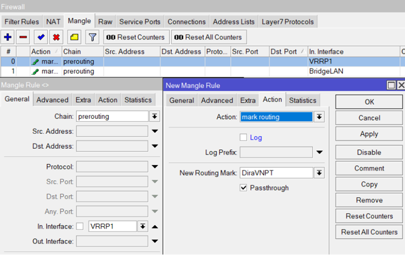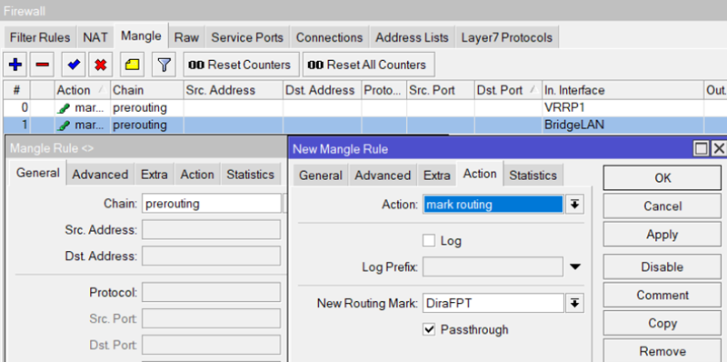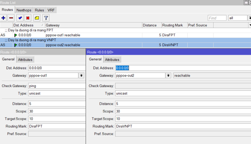 Bạn vào lại Menu IP –> Route, xây dựng 2 đường đi có tên “DiraFPT” & “DiraVNPT”