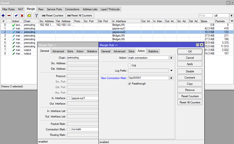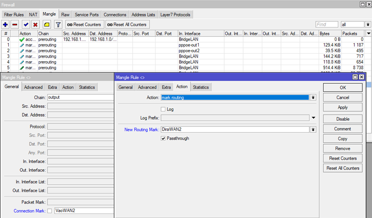 add action=mark-connection chain=prerouting connection-mark=no-mark in- interface=pppoe-out1 new-connection-mark=VaoWAN1 passthrough=yes add action=mark-connection chain=prerouting connection-mark=no-mark in- interface=pppoe-out2 new-connection-mark=VaoWAN2 passthrough=yes