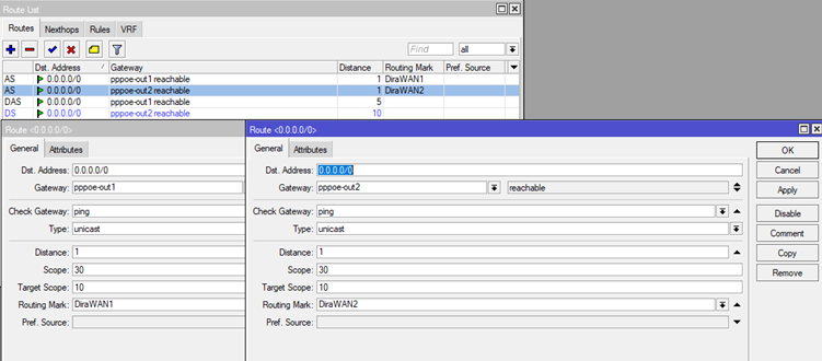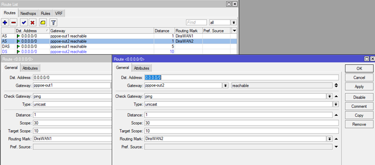 addcheck-gateway=pingdistance=1gateway=pppoe-out1routing-mark=DiraWAN1 addcheck-gateway=pingdistance=1gateway=pppoe-out2routing-mark=DiraWAN2