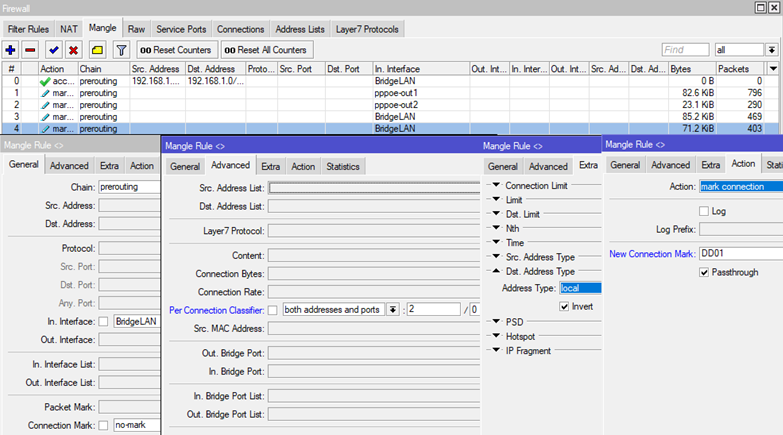 add action=mark-connection chain=prerouting connection-mark=no-mark dst-address- type=!localin-interface=BridgeLANnew-connection-mark=DD03passthrough=yesper- connection-classifier=both-addresses-and-ports:3/2