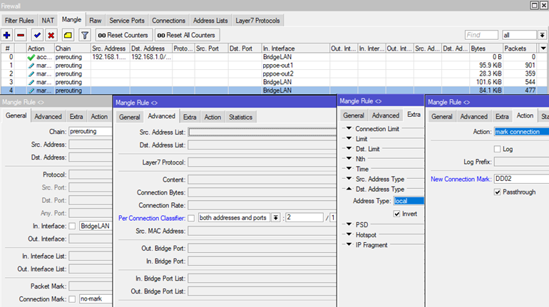 add action=mark-connection chain=prerouting connection-mark=no-mark dst-address- type=!localin-interface=BridgeLANnew-connection-mark=DD02passthrough=yesper- connection-classifier=both-addresses-and-ports:2/1