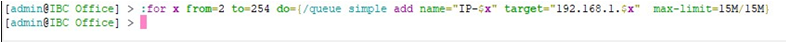 :for x from=2 to=254 do={/queue simple add name=”IP-$x” target=”192.168.1.$x” max-limit=15M/15M}