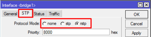 Lưu ý: Các bộ định tuyến Mikrotik được trang bị Giao thức RSTP có chức năng ngăn chặn các vòng lặp trên mạng cầu. Về cơ bản, cách thức hoạt động của RSTP này giống như STP vì RSTP là sự phát triển của giao thức Cây Spanning (STP). Cả STP và RSTP sau này sẽ “chặn” một trong những cổng trong bridge. Các cổng ở trạng thái chặn sẽ không tiếp tục tải lưu lượng. Bởi vì RSTP là một sàng lọc của STP, sự khác biệt là về thời gian chuyển từ trạng thái hoạt động sang điều kiện chuyển tiếp sang mỗi cổng. Đó là, RSTP sẽ cung cấp xác định đường dẫn nhanh hơn STP