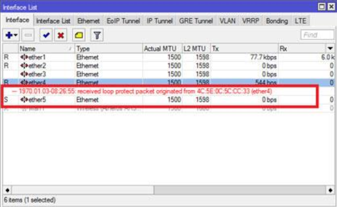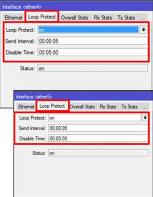 Sau khi kích hoạt bảo vệ vòng lặp (trạng thái ON), bạn cũng có thể điều chỉnh Thời gian gửi và vô hiệu hóa thời gian gửi. Khoảng thời gian gửi được sử dụng làm khoảng thời gian để gửi vòng lặp bảo vệ các gói protcol. Trong khi Vô hiệu hóa Thời gian được sử dụng là khoảng thời gian cổng không hoạt động bởi bộ định tuyến sau khi vòng lặp được phát hiện. Và cổng sẽ hoạt động trở lại sau khi hết giờ hoặc hết thời gian vô hiệu hóa. Sau khi hết thời gian, giao diện Loop Protect sẽ gửi lại gói bảo vệ vòng lặp. Nếu tất cả các bước trên đã được thực hiện, có vẻ như khi một vòng lặp xảy ra hoặc vòng lặp được phát hiện trên mạng, nhật ký thông báo màu đỏ sẽ ngay lập tức xuất hiện như hình dưới đây. Trạng thái ether4 thay đổi thành “vô hiệu hóa” cho đến khi vòng lặp kết thúc và bộ hẹn giờ bị vô hiệu hóa cổng kết thúc.