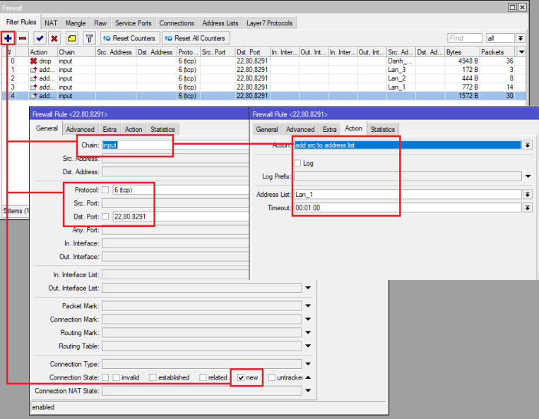 | /ip firewall fi add chain=input protocol=tcp dst-port=22,80,8291 src-address-list=Danh_Sach_Chan action=drop add chain=input protocol=tcp dst-port=22,80,8291 connection-state=new src-addresslist=Lan_3 action=add-src-to-address-list address-list=Danh_Sach_Chan address-listtimeout=10d add chain=input protocol=tcp dst-port=22,80,8291 connection-state=new src-addresslist=Lan_2 action=add-src-to-address-list address-list=Lan_3 address-list-timeout=1m add chain=input protocol=tcp dst-port=22,80,8291 connection-state=new src-addresslist=Lan_1 action=add-src-to-address-list address-list=Lan_2 address-list-timeout=1m add chain=input protocol=tcp dst-port=22,80,8291 connection-state=new action=add-src-toaddress-list address-list=Lan_1 address-list-timeout=1m |
