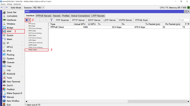 - Tại giao diện winbox: PPP => Interface => “+” => PPPoE Client (Bạn đóng vai trò là PPPoE Client còn ISP là PPPoE Server)