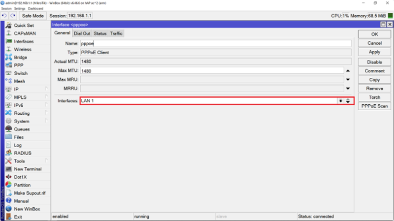 - Cửa sổ Interface PPPoE hiện ra, tại thẻ General mục Interfaces bạn chọn một cổng Ethernet muốn làm cổng WAN, ở đây tôi chọn cổng Ethernet 1/LAN 1 làm cổng WAN để đi ra ngoài Internet