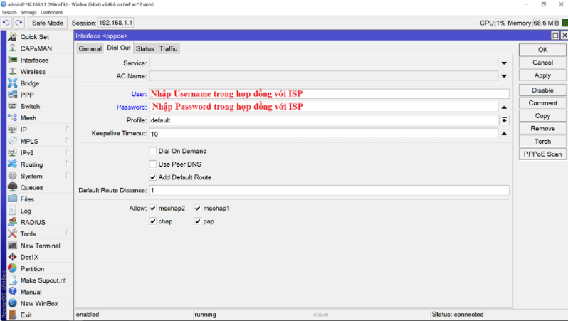Bước 2: Khai báo thông tin truy cập internet (quay PPPoE)
