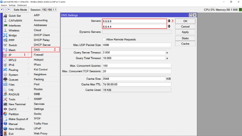 - Quay lại với MikroTik, bạn cần chọn máy chủ DNS để router lấy thông tin. Trong bài viết này tôi sử dụng DNS của Google vì nó hoạt động tốt và dễ nhớ. Hai máy chủ DNS của Google được sử dụng phổ biến có địa chỉ IP là 8.8.8.8 và 8.8.4.4. Không thích dùng của Google thì có thể sử dụng DNS của CloudFlare có địa chỉ IP là 1.1.1.1 và 1.0.0.1