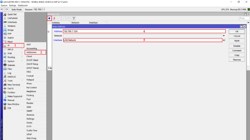 - Thao tác như sau: IP => Addresses => “+” => tại Address bạn nhập địa chỉ IP Private bạn muốn. VD: 192.168.1.1/24