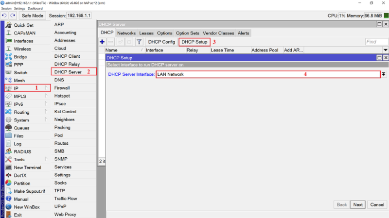 - IP => DHCP Server => DHCP Setup => DHCP Server Interface => bạn chọn nhóm LAN Network để Router cấp địa chỉ IP tự động cho cả nhóm LAN Network. Sau đó thì next liên tục cho đến khi kết thúc