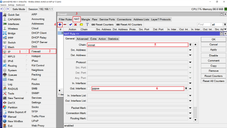 - Tại thẻ General mục Chain chọn srcnat, mục Out. Interface chọn PPPoE tương ứng với đường line mà bạn muốn NAT
